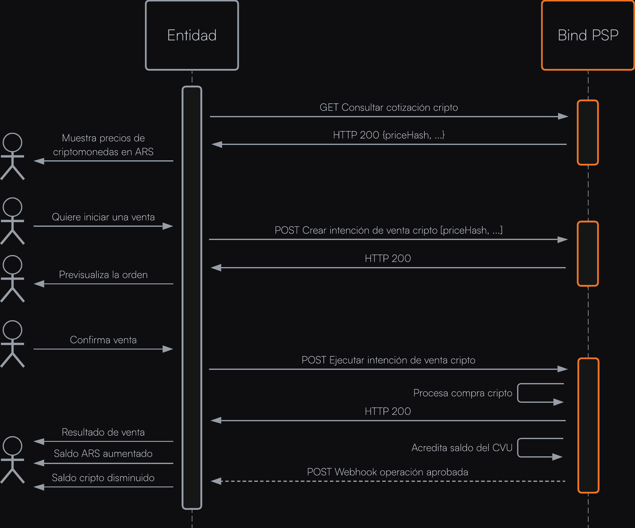Al concretarse una operación de venta de criptomonedas, las mismas se debitan del saldo de la cuenta cripto y acredita saldo de la moneda FIAT de la cuenta de la billetera asociada.