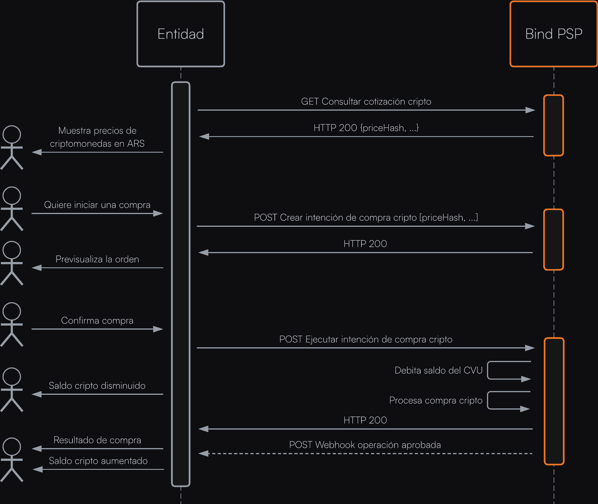 Esta solución permite comprar o vender distintas criptomonedas. Las operaciones de criptomonedas se gestionan desde una cuenta cripto asociada a cada cuenta de la billetera.